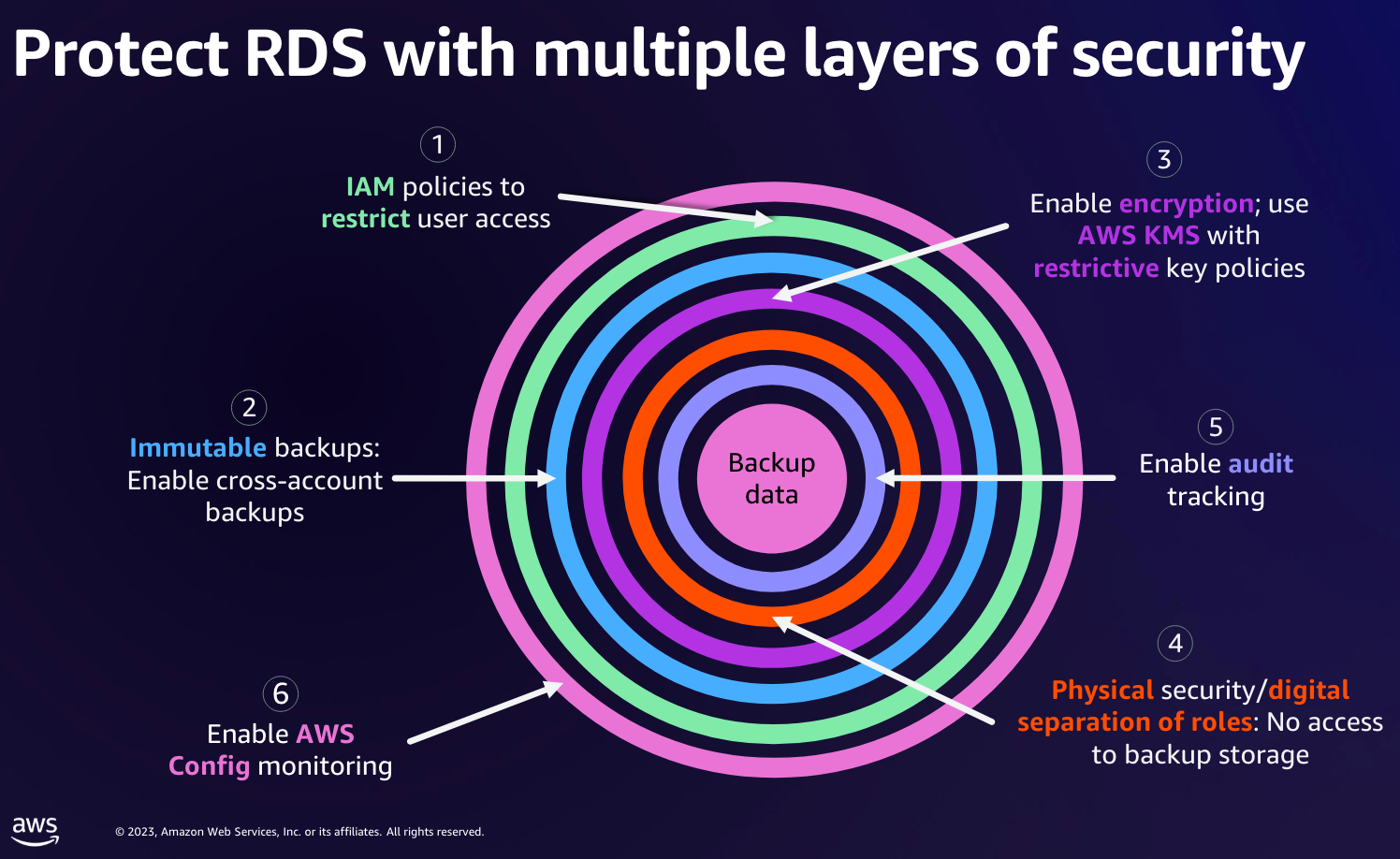 In June 2023, I had the opportunity to co-host an interactive Chalk talk session! In which we guided customers through the anatomy of a ransomware event targeting data residing in Amazon RDS. We discussed detailed best practices for detection, response, recovery, and protection. re:Inforce 2023, session TDR431.